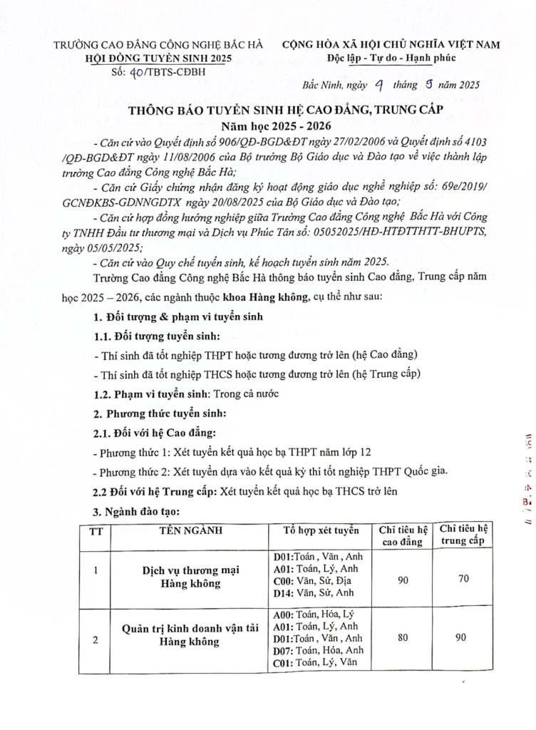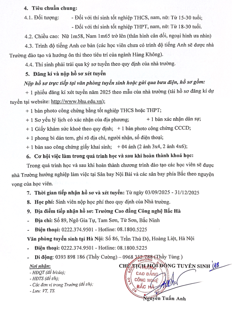 Trường Cao đẳng Công nghệ Bắc Hà thông báo tuyển sinh khối ngành Hàng không gồm: