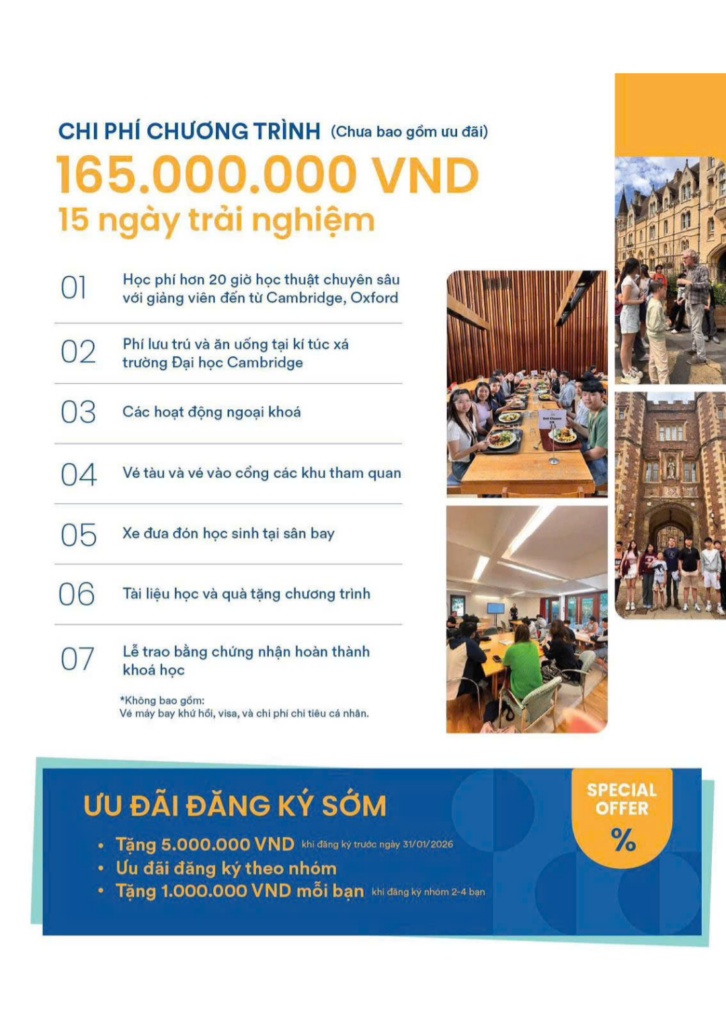 Với mức chi phí hợp lý, chương trình trại hè tại University of Cambridge mang đến trải nghiệm học tập và sinh hoạt toàn diện trong môi trường quốc tế. Học viên sẽ được tham gia các buổi học học thuật chuyên sâu, lưu trú tại ký túc xá hiện đại, cùng nhiều hoạt động ngoại khóa và tham quan thực tế hấp dẫn.