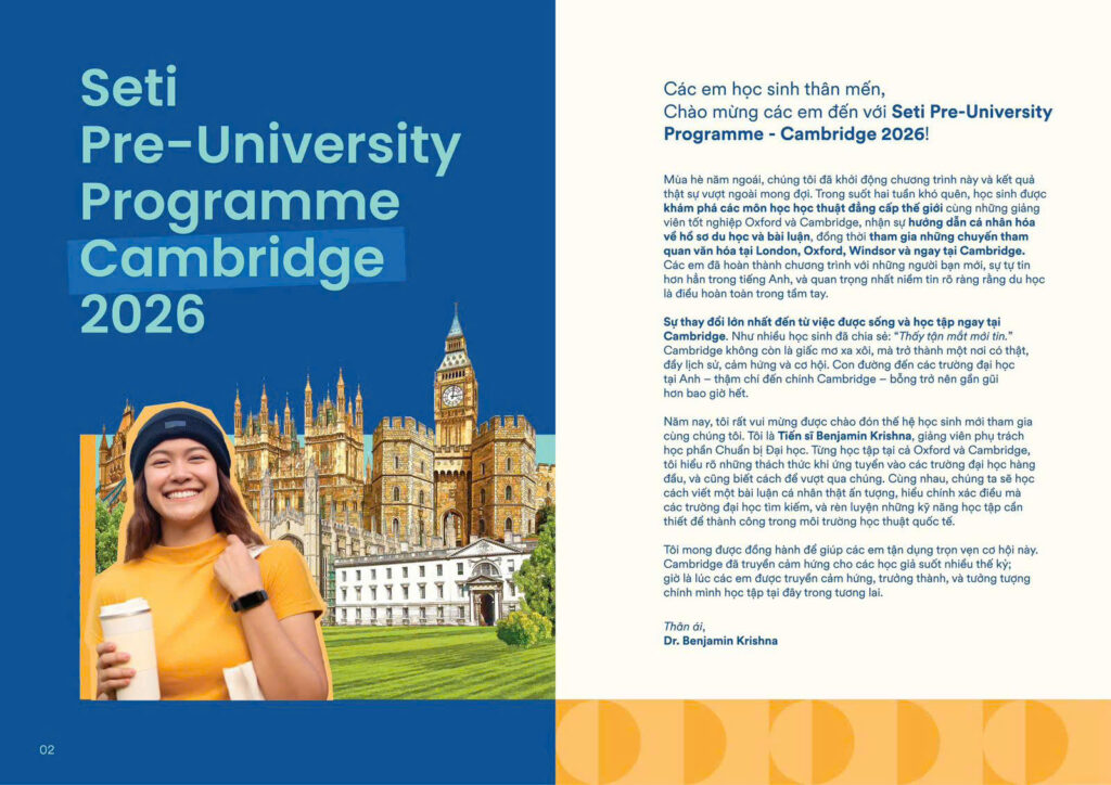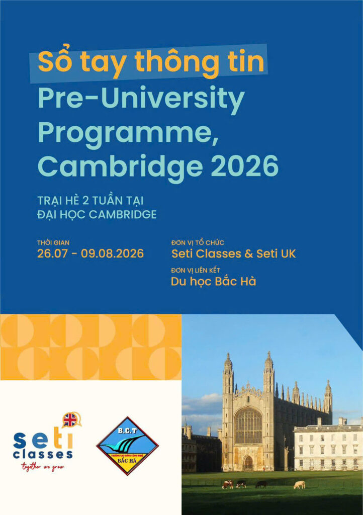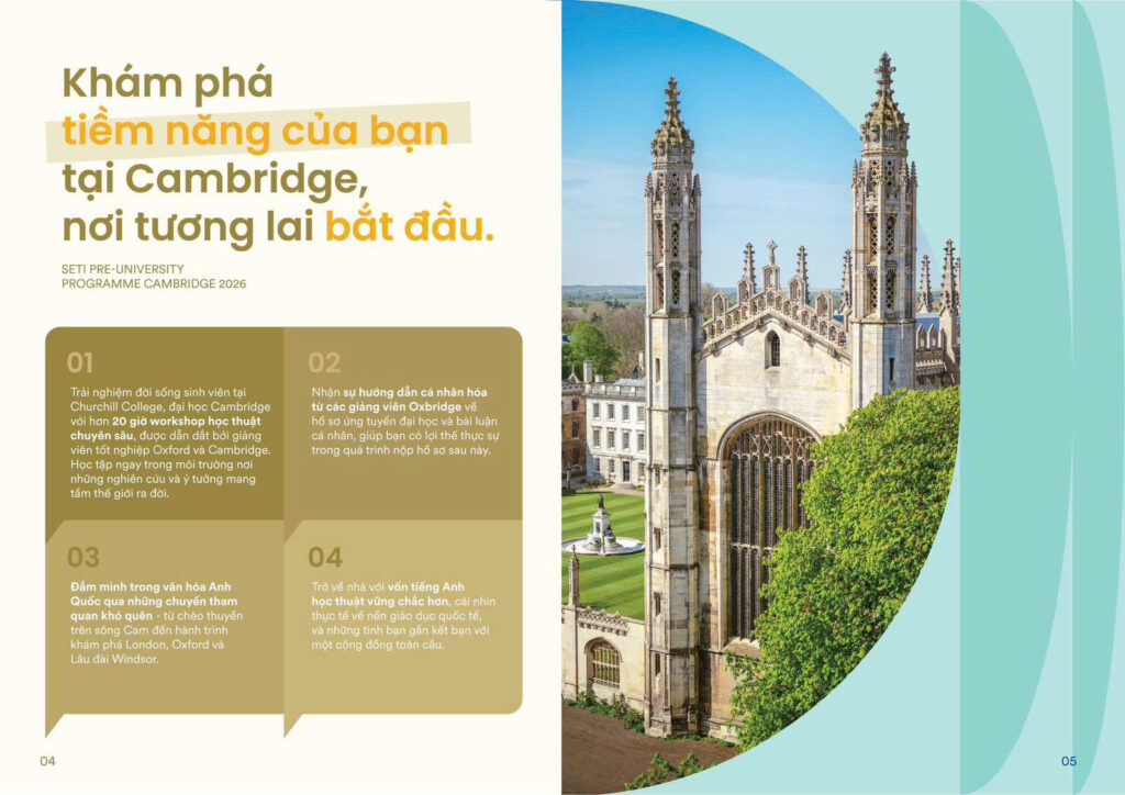 Chúng tôi trân trọng giới thiệu chương trình trại hè hướng nghiệp quốc tế tại University of Cambridge – nơi hội tụ tinh hoa giáo dục và môi trường học tập đẳng cấp hàng đầu thế giới. Với mong muốn mang đến cho học viên những trải nghiệm học thuật, kỹ năng và định hướng rõ ràng cho tương lai, chương trình được thiết kế toàn diện, kết hợp giữa học tập, trải nghiệm và khám phá văn hóa.