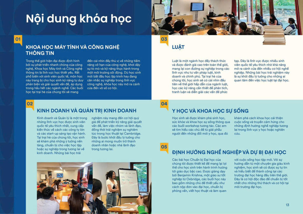 Nội dung khóa học tại trại hè hướng nghiệp của University of Cambridge được thiết kế đa dạng và thực tiễn, giúp học viên khám phá nhiều lĩnh vực học thuật khác nhau như công nghệ, kinh doanh, luật và khoa học đời sống. Thông qua các buổi học chuyên đề, workshop tương tác và hoạt động nhóm, học viên không chỉ tiếp thu kiến thức nền tảng mà còn phát triển kỹ năng tư duy, giao tiếp và giải quyết vấn đề. Bên cạnh đó, chương trình còn lồng ghép định hướng nghề nghiệp và chuẩn bị hành trang vào đại học, giúp học viên có cái nhìn rõ ràng hơn về con đường tương lai trong môi trường giáo dục quốc tế.